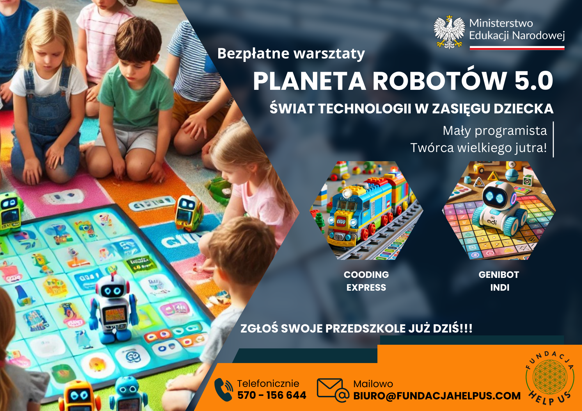 W ramach przedsięwzięcia, zaplanowano organizację i realizację 45 warsztatów kodowania, programowania i robotyki, bazujących na edukacyjnym programie Fundacji HELP US, wykorzystującym m.in. najinteligentniejsze na rynku roboty GeniBOT, robotyczne zestawy kreatywne LEGO oraz inteligentne, programowalne zabawki (m.in. roboty INDI).