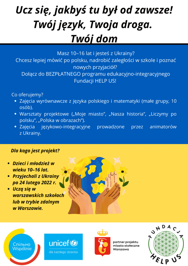 Projekt „Ucz się, jakbyś tu był od zawsze!” to bezpłatny program edukacyjno-integracyjny skierowany do dzieci i młodzieży z Ukrainy w wieku 10–16 lat mieszkających w Warszawie i okolicach.